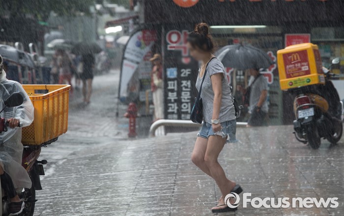 (서울=포커스뉴스) 9일 오후 서울 동작구 이수역 인근에 한 시민이 비를 피하기 위해 발걸음을 재촉하고 있다.