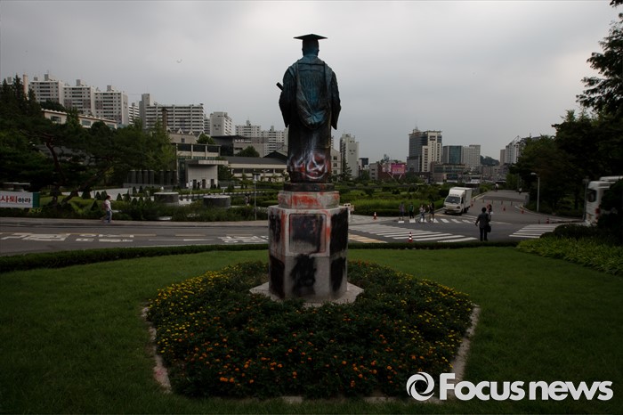 (서울=포커스뉴스) 이화여자대학교 최경희 총장이 학생들이 요구한 '9일 오후 3시까지 사퇴'를 거부한 9일 오후 서울 마포구 이화여자대학교에 초대 총장 김활란 동상이 보이고 있다.