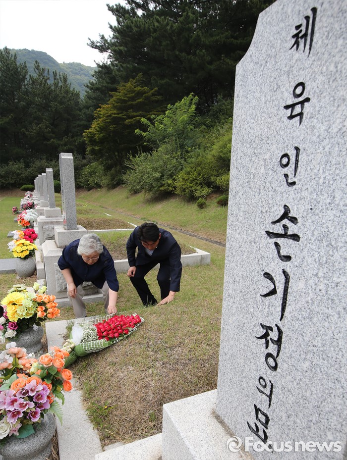 (대전=포커스뉴스) 9일 오후 대전 유성구 국립대전현충원 국가사회공헌자묘역에서 베를린 올림픽 마라톤 금메달리스트 손기정 선수의 딸 손문영 여사와 외손주인 이준승 손기정기념재단 사무총장이 손기정 선수 묘소에 헌화하고 묘역을 둘러보고 있다. 손기정 선수는 80년 전인 1936년 8월 9일 베를린 올림픽 마라톤에서 금메달을 목에 걸었다.