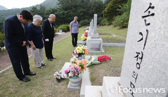 (대전=포커스뉴스) 9일 오후 대전 유성구 국립대전현충원 국가사회공헌자묘역에서 베를린 올림픽 마라톤 금메달리스트 손기정 선수의 딸 손문영 여사와 외손주인 이준승 손기정기념재단 사무총장이 손기정 선수 묘소에 참배하고 있다. 손기정 선수는 80년 전인 1936년 8월 9일 베를린 올림픽 마라톤에서 금메달을 목에 걸었다.