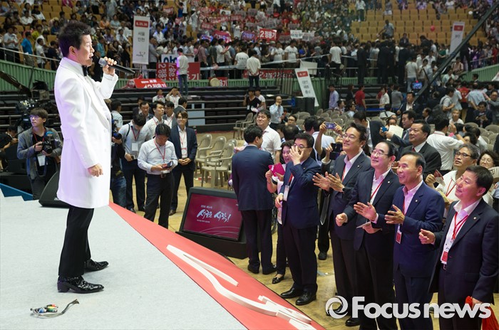 (서울=포커스뉴스) 9일 오후 서울 송파구 잠실실내체육관에서 열린 새누리당 4차 전당대회에 참석한 정진석 원내대표 등 의원들이 가수 태진아의 축하공연을 관람하고 있다.