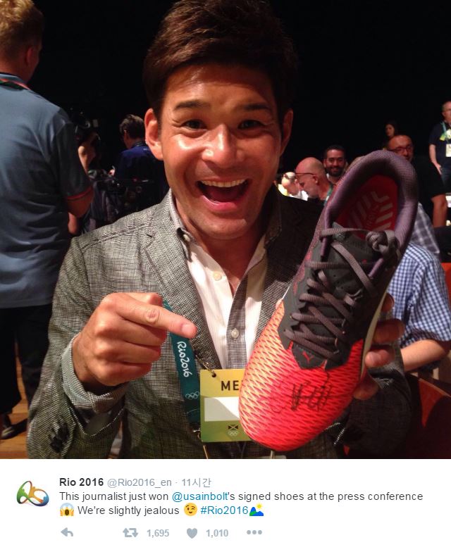특히 우사인 볼트의 사인이 적힌 운동화를 증정받은 한 일본 방송기자는 환한 웃음으로 기쁨을 표현했다.