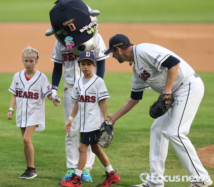 (서울=포커스뉴스) 9일 서울 잠실구장에서 열린 2016 프로야구 KIA-두산 경기에 앞서 두산 투수 니퍼트가 시구를 마친 아들 케이든의 엉덩이를 두드리고 있다.