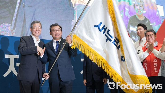 (서울=포커스뉴스) 9일 오후 서울 송파구 잠실실내체육관에서 열린 제4차 새누리당 전당대회에서 당대표로 선출된 이정현(오른쪽)이 김희옥 혁신비상대책위원장으로부터 당기를 전달 받고 있다.