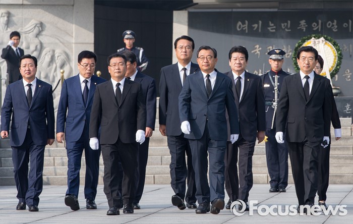 (서울=포커스뉴스) 8·9 전당대회에서 새누리당 대표로 선출된 이정현 대표가정진석 원내대표, 김광림 정책위의장, 박명재 사무총장 및 최고위원 등과 함께 10일 오전 서울 동작구 국립현충원을 찾아 참배 후 발걸음을 옮기고 있다.
