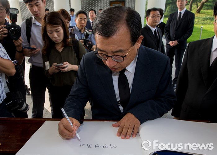 (서울=포커스뉴스) 8·9 전당대회에서 새누리당 대표로 선출된 이정현 대표가 10일 오전 서울 동작구 국립현충원을 찾아 참배 후 방명록을 작성하고 있다.