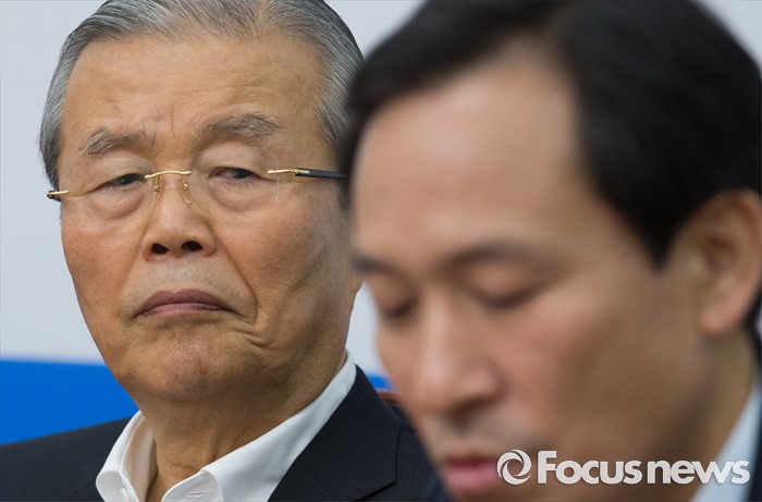 (서울=포커스뉴스) 10일 오전 서울 여의도 국회에서 열린 더불어민주당 비상대책위원회의에 참석한 김종인(왼쪽) 비대위 대표가 우상호 원내대표의 발언을 듣고 있다.
