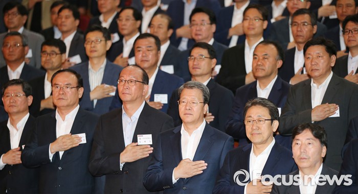 (세종=포커스뉴스) 임환수(앞줄 오른쪽 세 번째) 국세청장이 10일 오전 세종시 정부세종2청사 국세청에서 열린 전국세무관서장회의에 참석해 국기에 대한 경례를 하고 있다.
