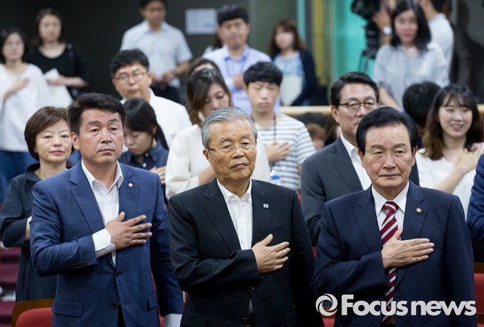 (서울=포커스뉴스) 10일 오전 서울 여의도 국회 의원회관에서 열린 더불어민주당 청년지원사업(청년수당)으로 본 청년 구직지원 및 구직안전망 긴급토론회에 참석한 김종인(가운데) 비대위 대표와 변재일(오른쪽) 정책위의장, 기동민 의원 등이 국기에 대한 경례를 하고 있다.