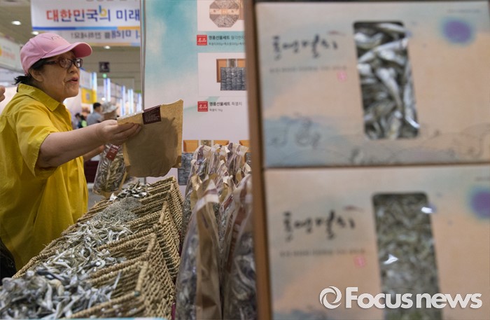 (서울=포커스뉴스) 10일 오후 서울 강남구 코엑스에서 열린 '2016 한가위 명절선물상품전'을 찾은 한 시민이 멸치선물세트를 보고 있다.