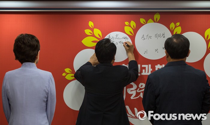 (서울=포커스뉴스) 정진석(가운데) 새누리당 원내대표가 10일 오전 서울 여의도 새누리당사에서 열린 최고위원회의에 참석해 혁신과 화합의 나무에 서명을 하고 있다.