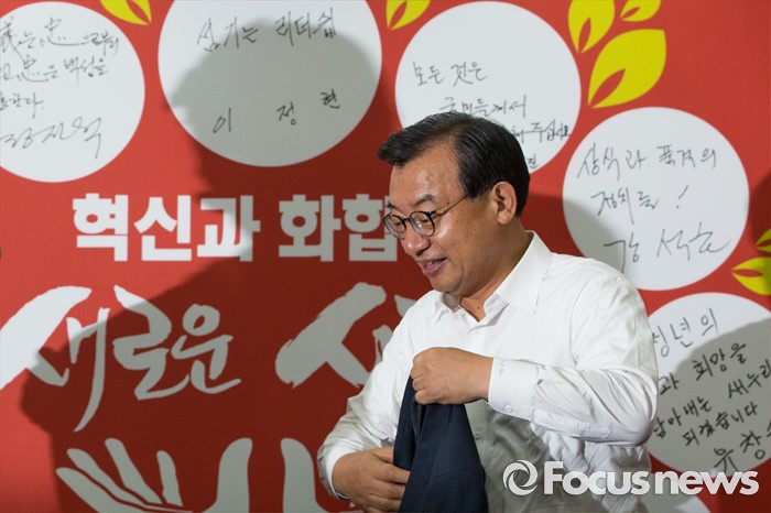 (서울=포커스뉴스) 이정현 새누리당 대표가 10일 오전 서울 여의도 새누리당사에서 열린 최고위원회의에 참석해 회의에 앞서 양복 상의를 벗고 있다.