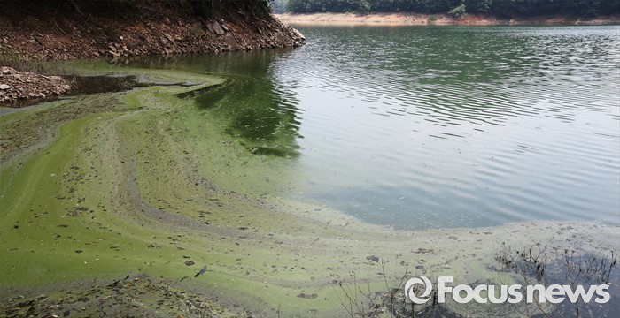 (청주=포커스뉴스) 10일 충북 청주시 문의면 일대 대청호에서 녹조와 녹조부유물이 보이고 있다. 지난 3일 대청호 전 수역에 조류 경보 '관심단계'가 발령됐다. 문의지역의 유해 남조류 세포수가 1ml당 7470을 기록했다.