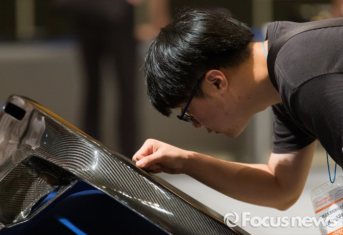 (서울=포커스뉴스) 10일 오후 서울 강남구 코엑스에서 열린 '2016 오토모티브 테크놀로지 엑스포'을 찾은 한 관람객이 카본으로 제작된 자동차 부품을 만져보고 있다.