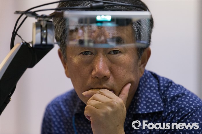 (서울=포커스뉴스) 10일 오후 서울 강남구 코엑스에서 열린 '2016 오토모티브 테크놀로지 엑스포'을 찾은 한 관람객이 헤드업 디스플레이(HUD)를 바라보고 있다.