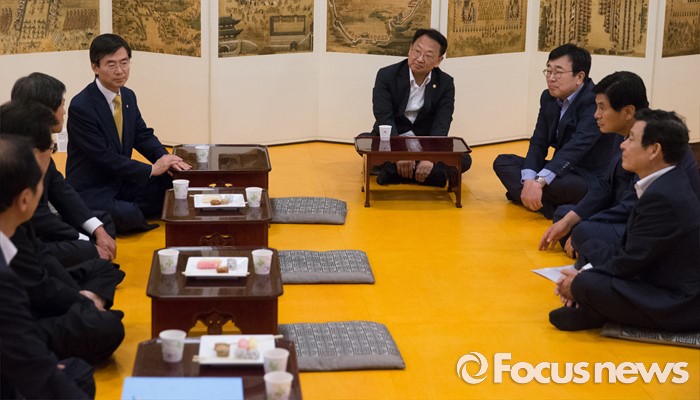 (서울=포커스뉴스) 10일 오후 서울 여의도 국회 사랑재에서 열린 지역경제 활성화를 위한 규제프리존 특별법 왜 필요한가? 간담회에 앞서 조경태 기획재정위원장과 유일호 경제부총리 겸 기획재정부 장관, 서병수 부산시장, 윤장현 광주시장, 이춘희 세종시장 등이 티타임을 갖고 있다.
