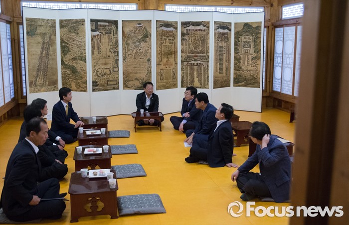 (서울=포커스뉴스) 10일 오후 서울 여의도 국회 사랑재에서 열린 지역경제 활성화를 위한 규제프리존 특별법 왜 필요한가? 간담회에 앞서 조경태 기획재정위원장과 유일호 경제부총리 겸 기획재정부 장관, 서병수 부산시장, 윤장현 광주시장, 이춘희 세종시장 등이 티타임을 갖고 있다.