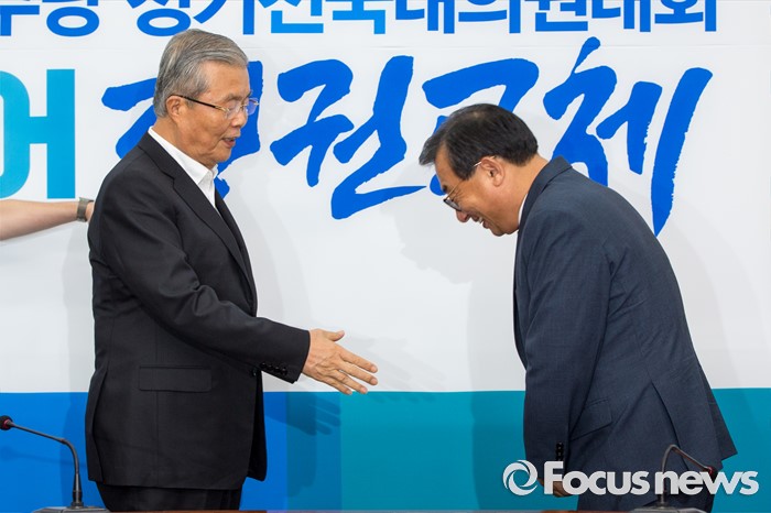 (서울=포커스뉴스) 김종인(왼쪽) 더불어민주당 비상대책위 대표와 이정현 새누리당 대표가 10일 오후 서울 여의도 국회에서 면담에 앞서 인사하고 있다.