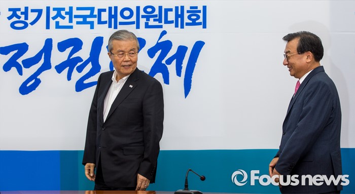 (서울=포커스뉴스) 김종인(왼쪽) 더불어민주당 비상대책위 대표와 이정현 새누리당 대표가 10일 오후 서울 여의도 국회에서 면담하기 위해 면담장으로 들어서고 있다.