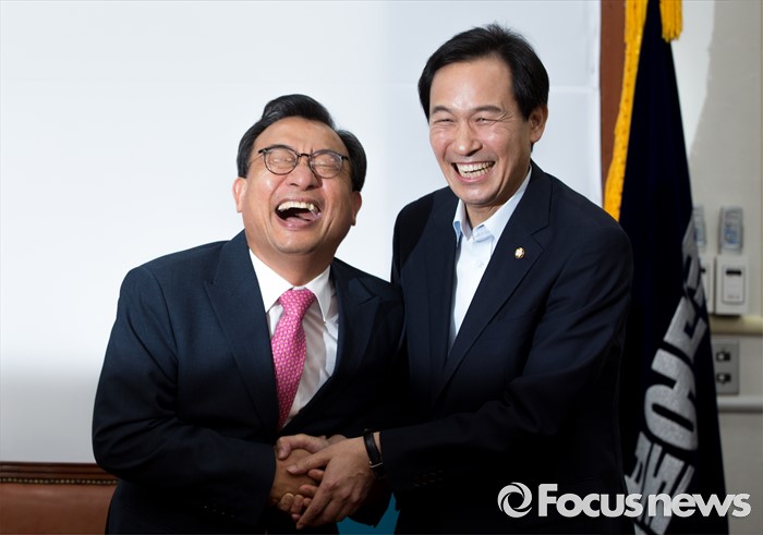(서울=포커스뉴스) 우상호(오른쪽) 더불어민주당 원내대표가 10일 오후 서울 여의도 국회에서 김종인 더불어민주당 비상대책위 대표를 예방한 이정현 새누리당 대표와 악수 하고 있다.