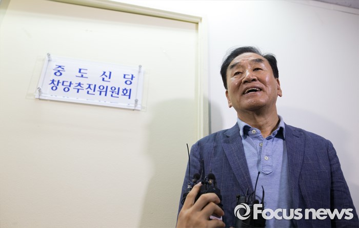(서울=포커스뉴스) 10일 오후 서울 종로구 대한변호사회관에서 이재오 전 의원이 중도신당 창당추진위원회 사무실 입주 및 현판식을 마치고 취재진 질문에 답하고 있다.
