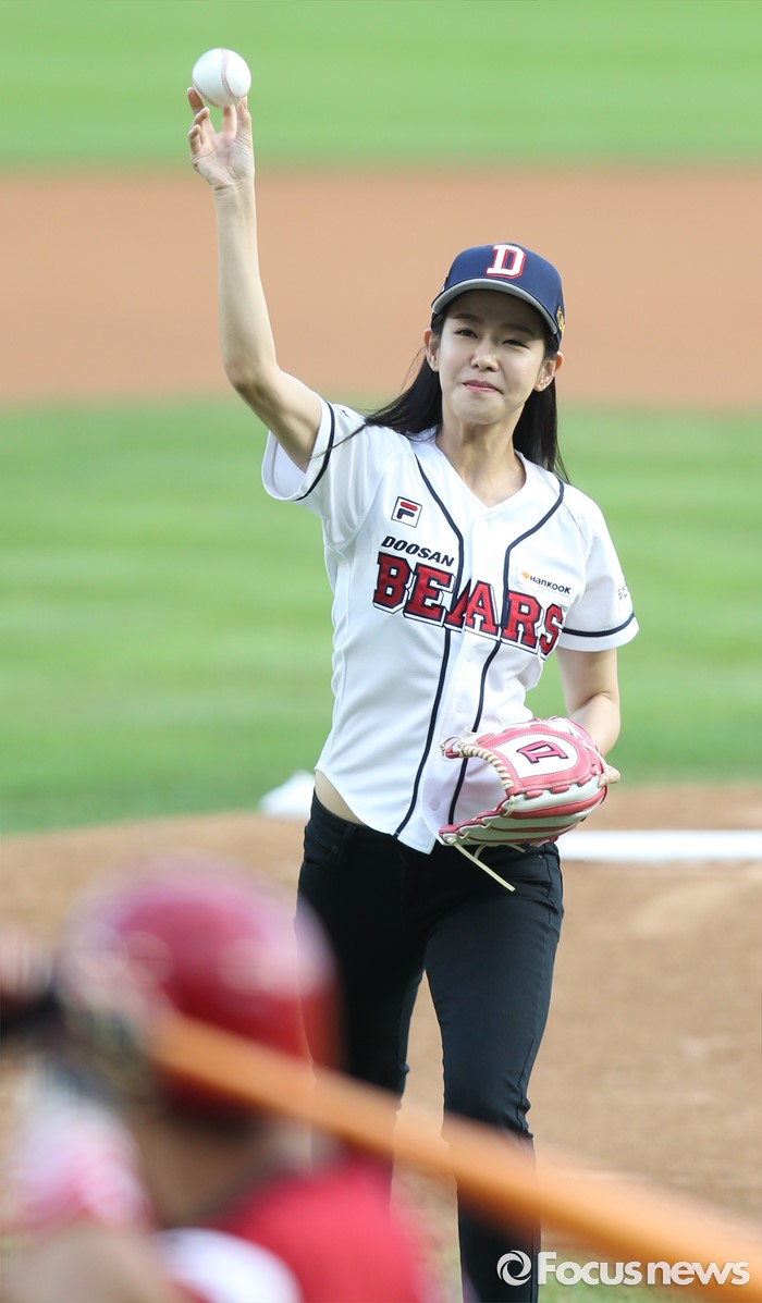 (서울=포커스뉴스) 10일 서울 잠실구장에서 열린 2016 프로야구 KIA-두산 경기에 앞서 배우 경수진이 시구하고 있다.