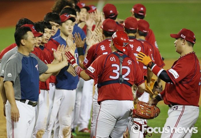 (서울=포커스뉴스) 10일 서울 잠실구장에서 열린 2016 프로야구 KIA-두산 경기에서 두산을 물리친 KIA 선수들이 그라운드에 모여 승리의 하이파이브를 하고 있다.