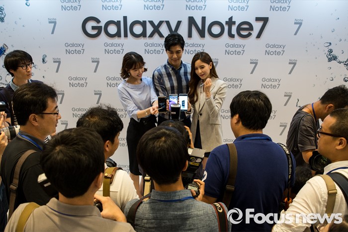 (서울=포커스뉴스) 11일 오전 서울 서초구 삼성전자 사옥에서 열린 '갤럭시 노트7 출시 미디어 행사'에서 모델들이 제품을 소개하고 있다.