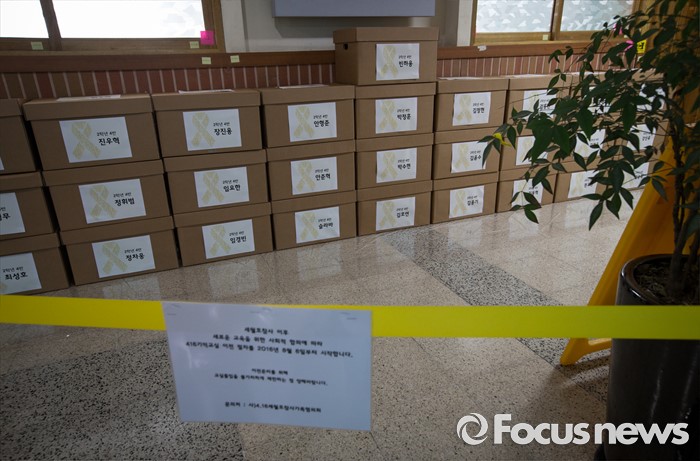 (안산=포커스뉴스) 세월호 참사에서 희생된 단원고등학교 학생들의 교실 이전 절차가 진행 중인 11일 오전 경기도 안산시 단원고등학교 기억교실 복도에 아이들 유품 및 기록물 보관함이 쌓여져 있다.