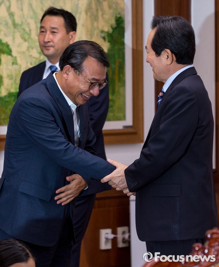 (서울=포커스뉴스) 이정현(왼쪽) 새누리당 대표가 11일 오후 서울 여의도 국회에서 정세균 국회의장을 예방해 면담에 앞서 악수 하고 있다.