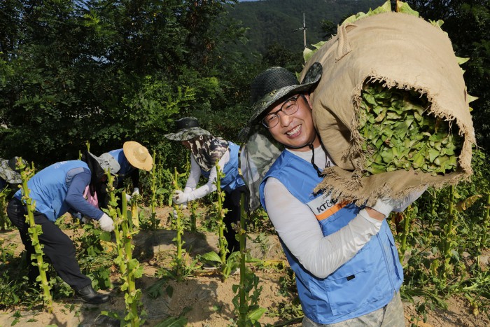 (서울=포커스뉴스) KT&G는 농번기 일손 부족을 겪고 있는 잎담배 농가들을 돕기 위해 봉사활동을 실시한다고 11일 밝혔다.