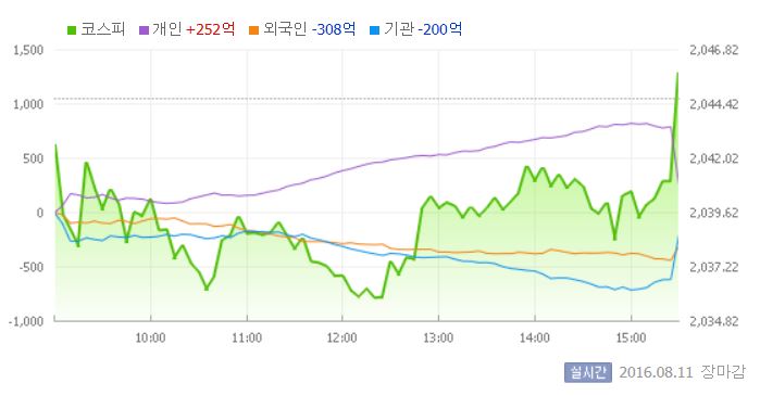 이날 코스피는 전일 대비 0.10% 하락한 2042.64로 장을 시작했다. 이후 지수는 외국인과 기관의 팔자세에 하락 폭을 확대하며 약세를 이어갔다. 그러나 장 중 기준금리가 동결됐다는 소식이 전해지면서 개인 매수세가 확대, 상승 전환에 성공했다.