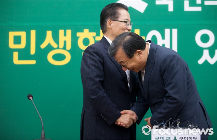 (서울=포커스뉴스) 11일 오후 서울 여의도 국회에서 박지원(왼쪽) 국민의당 비상대책위원장이 이정현 새누리당 대표와의 면담에 앞서 인사하고 있다.