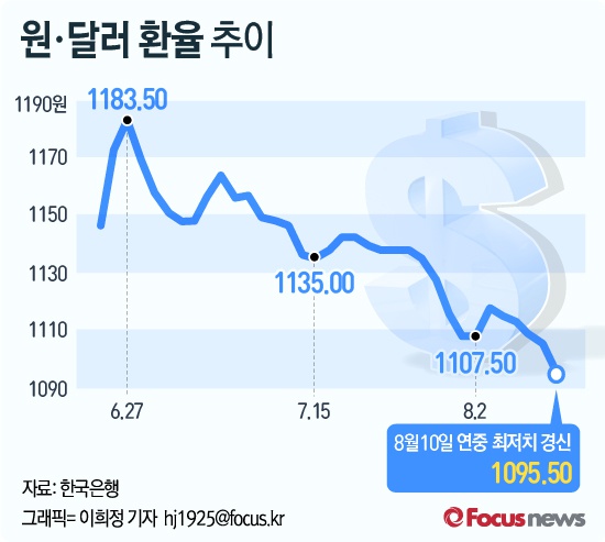 11일 금융업계에 따르면 지난 10일 원달러 환율은 1095.3원에 마감했다. 원달러 환율이 장중 1100원대를 밑돈 것은 지난 2015년 6월 22일 이후 약 13개월 만이다.