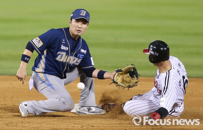 (서울=포커스뉴스) 11일 서울 잠실구장에서 열린 2016 프로야구 NC-LG 경기 4회말 1사 1,3루에서 LG 1루주자 손주인이 2루 도루를 시도해 세이프되고 있다.