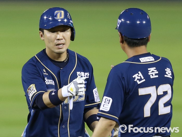 (서울=포커스뉴스) 11일 서울 잠실구장에서 열린 2016 프로야구 NC-LG 경기 6회초 2사 1루에서 NC 지석훈이 좌익수 왼쪽 2루타를 쳐 1루주자를 불러 들이고 2루에서 전준호 코치의 축하를 받고 있다.