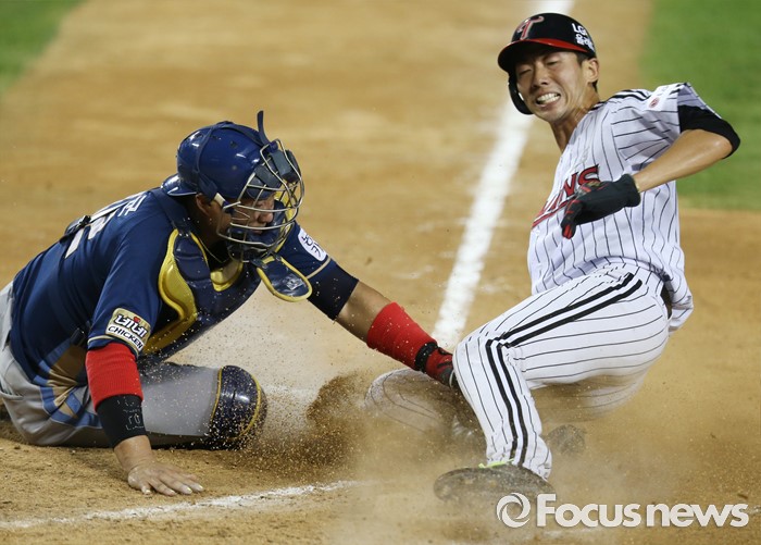 (서울=포커스뉴스) 11일 서울 잠실구장에서 열린 2016 프로야구 NC-LG 경기 5회말 선두타자로 나와 우익수 오른쪽에 떨어지는 3루타로 진루한 LG 김용의가 이천웅의 좌익수 희생플라이떄 홈으로 뛰어들어 세이프되고 있다.